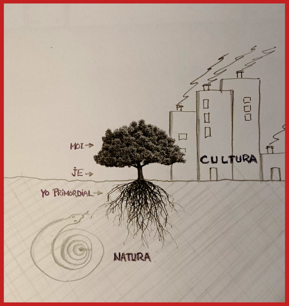 El árbol como metáfora puede aclarar estas nociones: raíz, tronco y fronda existen en dos dimensiones diferentes: subterránea y aérea. La tierra equivale a la naturaleza, allí se sostiene la raíz del árbol, es parte de ella, es el yo primordial. De la raíz se desarrolla y crece el tronco, equivalente al Je; se sostiene en la naturaleza y está afectado por sus instintos, pero ya existe en la dimensión aérea, correspondiente al complejo entramado cultural. En el tronco se sostiene luego la fronda del Moi, producto claro del lenguaje y la cultura.